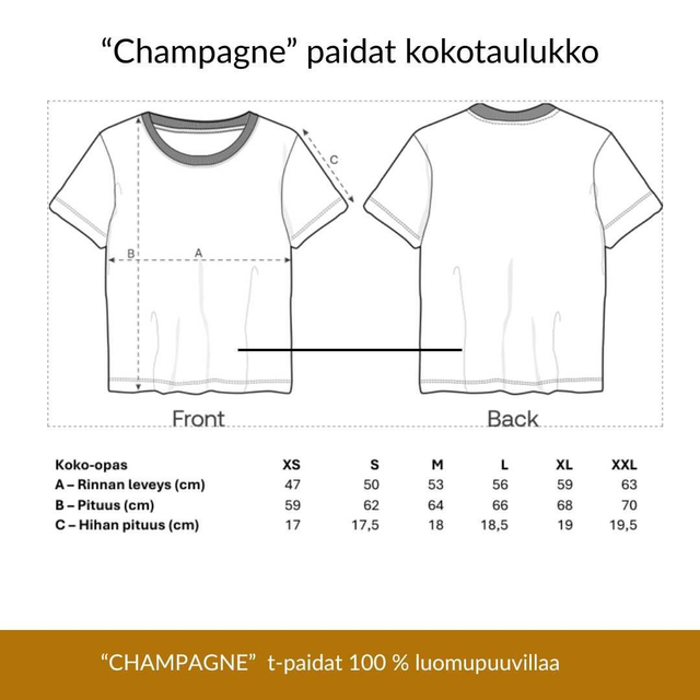 Musta t-paita tekstillä: "OK, BUT FIRST CHAMPAGNE". Teksti kultaglitterillä, joka pysyy pesusta pesuun. Paidassa pyöreä pääntie. Paita on laadukasta 100 % luomupuuvillaa, joka ei veny eikä vanu pesussa. Tarkista paidan mitat valokuvien mittataulukosta.