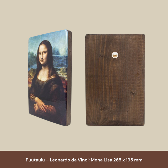 Tuo kotiisi maailman tunnetuin hymy tällä korkealaatuisella puutaululla, jossa on Leonardo da Vincin Mona Lisa. Teos on painettu kiiltävälle pinnalle, joka jatkuu hienovaraisesti myös reunoille, luoden aidon taideteoksen vaikutelman. Taulu on valmis ripustettavaksi – takana on valmiiksi kiinnitetty ripustuslenkki. Elegantti ja ajaton sisustuselementti, joka sopii niin kotiin kuin työtilaan.